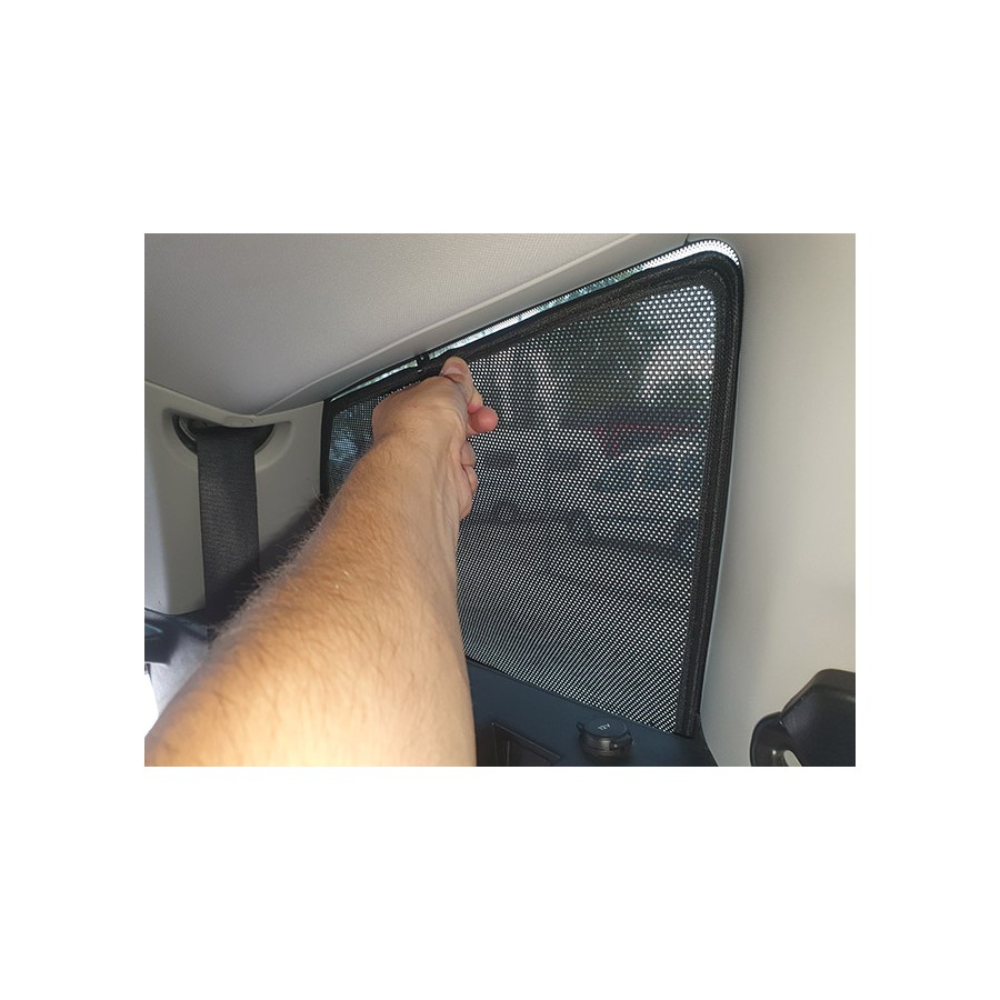 Sada - 6-ti dílů. Clony stíní zevnitř celou plochu oken. Jednoduchá montáž/demontáž nasazením zevnitř vozu. Clony jsou vyrobeny z černé tkaniny.