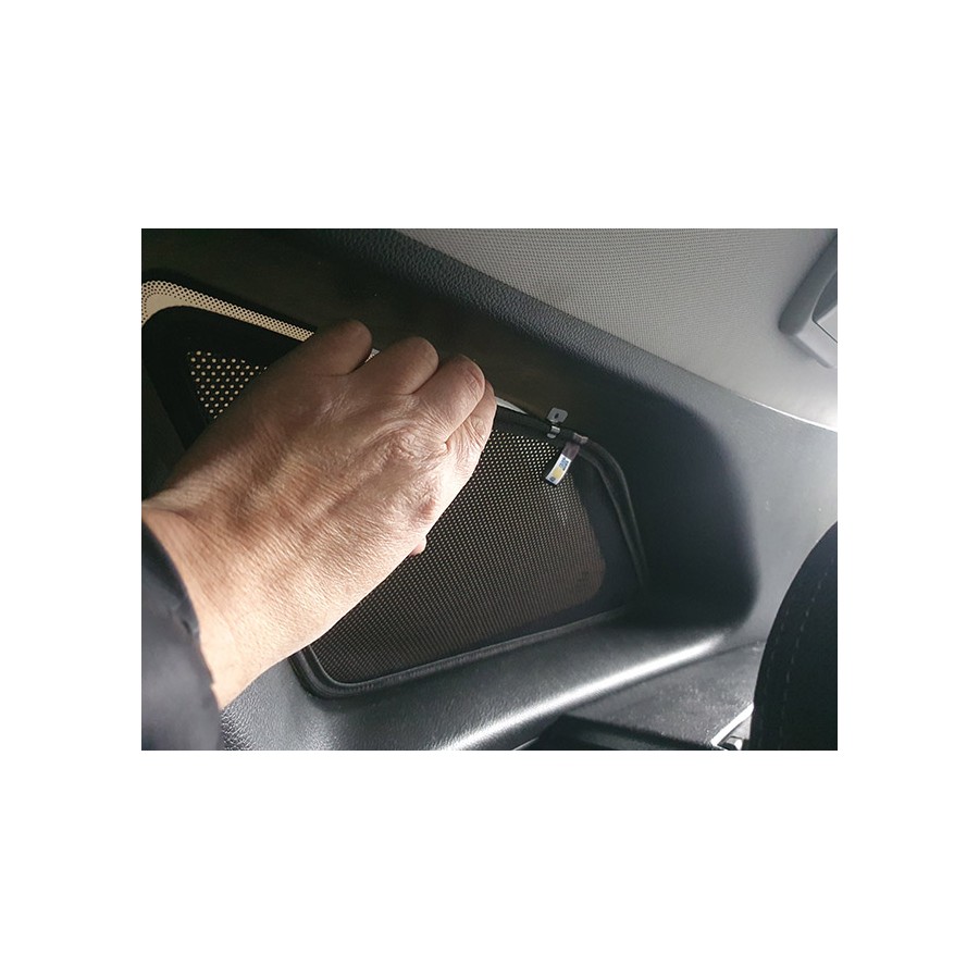 Sada - 6-ti dílů. Clony stíní zevnitř celou plochu oken. Jednoduchá montáž/demontáž nasazením zevnitř vozu. Clony jsou vyrobeny z černé tkaniny.