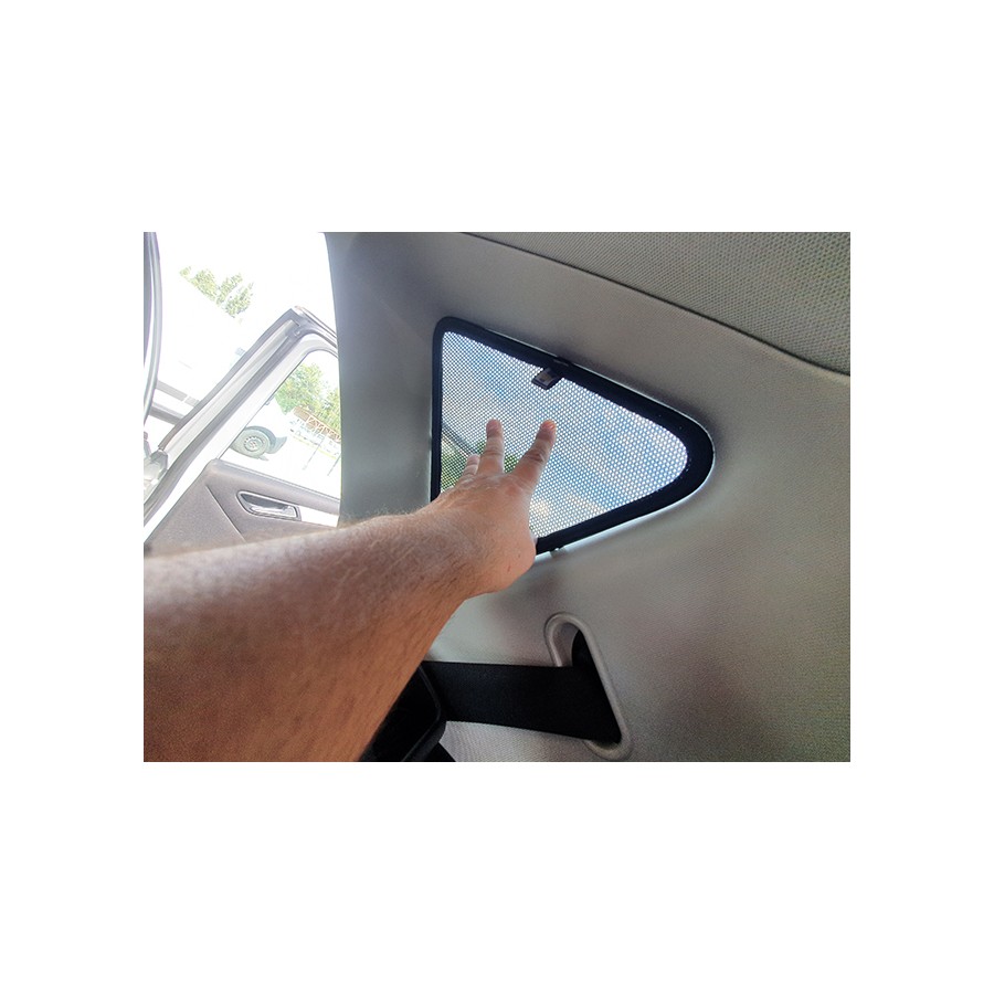 Sada - 5-ti dílů. Clony stíní zevnitř celou plochu oken. Jednoduchá montáž/demontáž nasazením zevnitř vozu. Clony jsou vyrobeny z černé tkaniny.