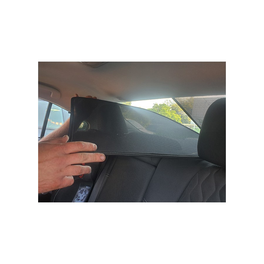 4 dílná sada . Clony stíní zevnitř celou plochu oken. Jednoduchá montáž/demontáž nasazením zevnitř vozu. Clony jsou vyrobeny z černé tkaniny.