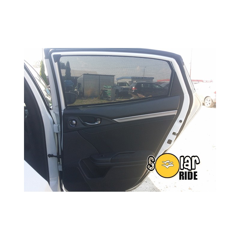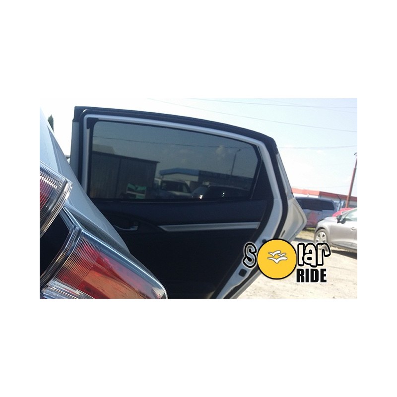 Ces pares soleil Honda Civic X Hatchback (2015- ) sont des pares soleil specifiques pour ce vehicule. Composes de 4 pieces ces pares soleil s'adaptent parfaitement aux vitres laterales ainsi que sur la vitre arriere.
