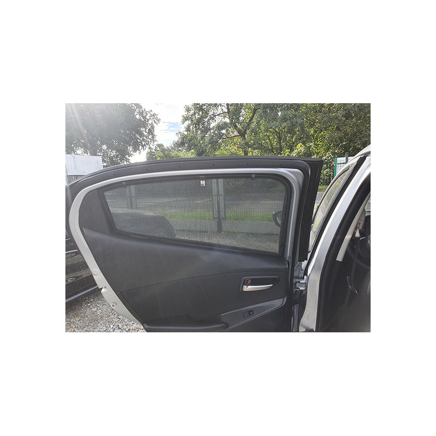 Ces pares soleil Mazda 2 III 2014-- sont des pares soleil specifiques pour ce vehicule. Composes de 3 pieces ces pares soleil s'adaptent parfaitement aux vitres laterales ainsi que sur la vitre arriere.